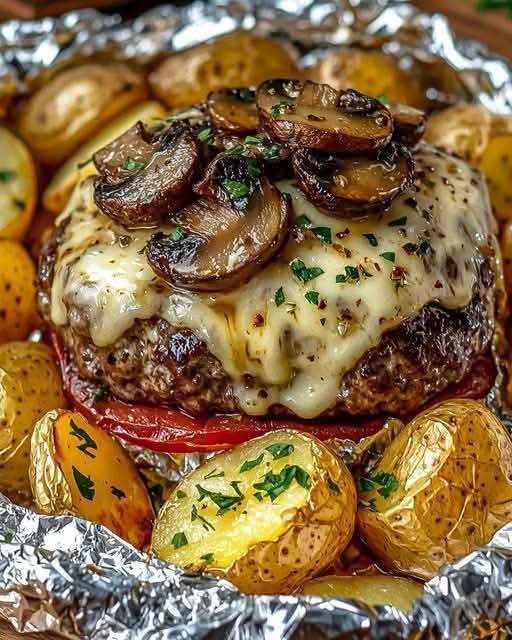 Foil packets trap steam and juices, creating a self-basting effect. The mushrooms release their natural moisture, blending with the beef juices to create a rich, savory sauce inside the packet. The result is a burger that’s tender, flavorful, and incredibly satisfying.